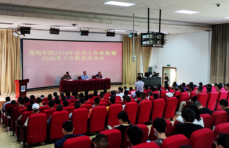9月4日,学校在旅游学院3D报告厅召开2019年征兵工作表彰暨2020年入伍新兵欢送会。学校党委书记陈永明、副校长郭华,官渡区人民武装部部长李斌出席会议并分别讲话。学校党委办公室、校长办公室、党委宣传部、学生工作部(人民武装部)、校团委、教务处、招生就业处等相关职能部门主要负责人,二级学院党委(党总支)书记、副书记,全体辅导员参加会议。
