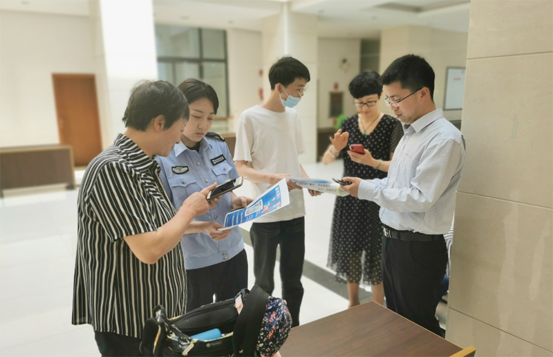 派出所民警在保卫处相关人员的陪同下,深入机关各部门为干部职工指导在手机上安装反电信诈骗小程序“金钟罩”,介绍“金钟罩”防骗使用功能,宣传电信网络防骗知识,接受防骗咨询服务。随后,保卫处和民警在行政楼D区一楼大厅为广大教职工开展咨询和服务。