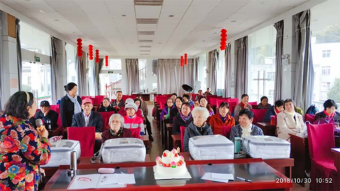 老寿星张翼民老师激动地上台表达了自己的心声,她说:“来云南从事幼师工作六十年,今年的生日是她一生中最高兴、最愉快的一次,感谢那么多老师送来的祝福,深深地感受到了党组织、教工支部这个集体的温暖和关怀”。张老师为教师们送上一包包红枣,表达她感谢之心。沈爱伦、尹伊两位老师也发表了生日感言,感谢在八十岁生日收到的支部全体教师的祝福,白冰老师更是激情献歌一曲《祖国好》表达心中的感谢之情。