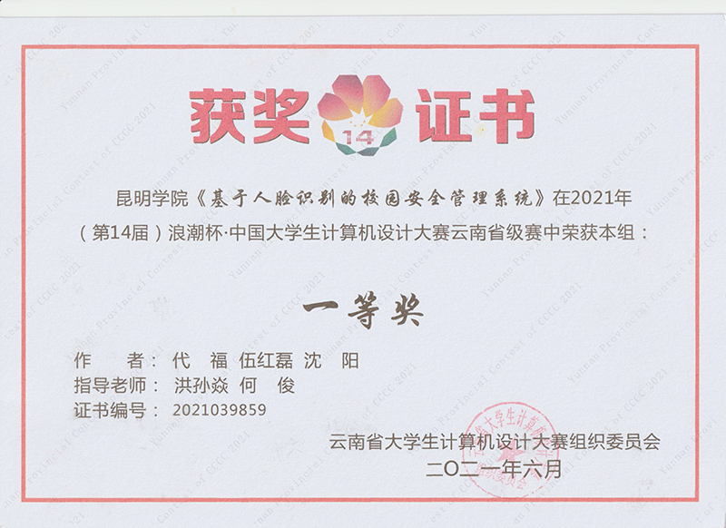 信息工程学院为加强学生实践动手能力培养,积极动员学生参加中国大学生计算机设计大赛。在学院老师的指导和关心下,信息工程学院共14支队伍参加了比赛,其中洪孙焱、何俊老师指导代福、伍红磊、沈阳设计的作品《基于人脸识别的校园安全管理系统》获得云南省一等奖;申浩如、陈星园老师指导邢睿琦、黄裕凯、王哲慧设计的作品《计算机科学虚拟博物馆》获得云南省二等奖。