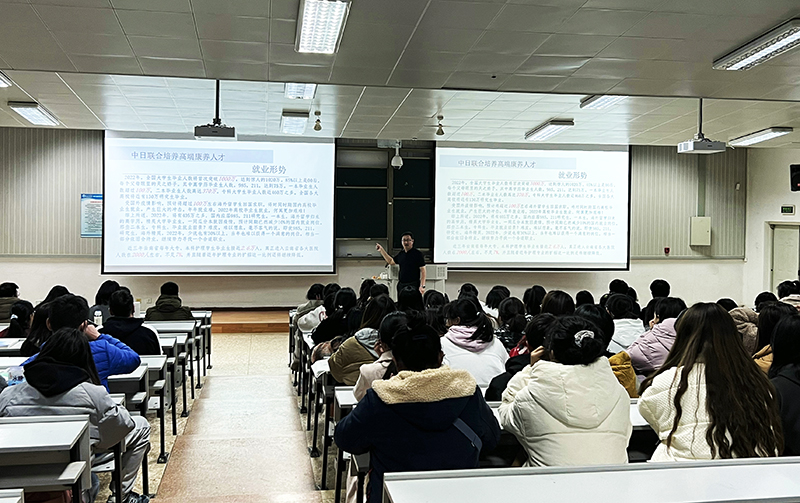 122日,医学院在博识楼10032001两个阶梯教室,同时开展中日联合培养高端康养人才项目推荐会。南天星联教育科技有限公司云南公司总经理杨帆,日语教师山地浩,职业规划师朱文国、相红伟、迟玲一行与同学们见面,为护理学专业全体在校学生进行了项目介绍。