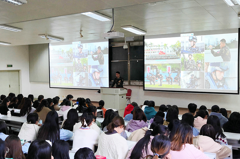 孙鹏采用图片、小视频等丰富的素材,结合自己的军旅成长故事,向同学们深入浅出地进行国家安全、国防观念的相关知识介绍,精彩的讲解不时赢得了大家的阵阵掌声。