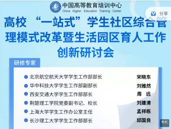 5月28日至29日,学校组织学生处、组织部、宣传部、团委、后勤集团、心理健康咨询中心等职能部门和各二级学院,以线上方式参加由中国高等教育培训中心举办的“高校一站式学生社区综合管理模式改革暨生活园区育人工作创新研讨会”。