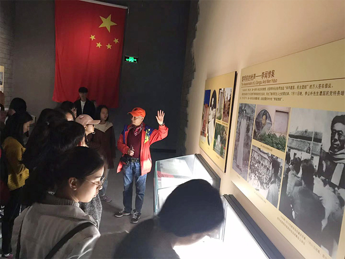 在云南省博物馆,老教授协会会长、关工委成员黄启后教授做临时讲解员,他带领同学们在百年风云馆,回顾了一段尘封百年的红土地沧桑岁月。重点讲解了革命先烈的英勇事迹和校友聂耳的历史,让同学们的心灵得到再一次的震撼,让大家对今天的幸福生活更加珍惜,并为有聂耳这位校友感到无比的自豪。