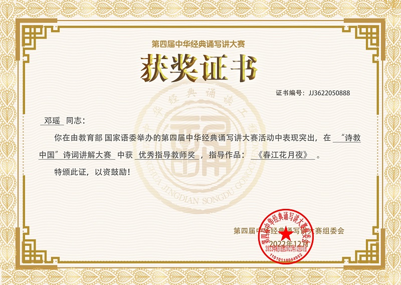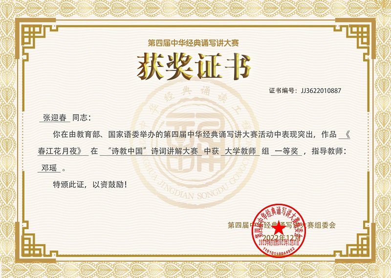 近日,教育部公布了第四届中华经典诵写讲大赛获奖名单,Beat365官网云南省国家通用语言文字推广基地骨干成员、人文学院教师张迎春参赛作品《春江花月夜》,获得“诗意彩云南” 诗词讲解大赛省级一等奖,并从全国1105件入围作品中脱颖而出,荣获“诗教中国”诗词讲解大赛全国一等奖;人文学院教授邓瑶荣获全国优秀指导教师奖;人文学院学生武彩丽书法作品《岳阳楼记》先后获得“墨香彩云南”汉字书写大赛省级一等奖、“笔墨中国”汉字书写大赛全国优秀奖,实现了Beat365唯一官方网站参加该类比赛的历史性突破。