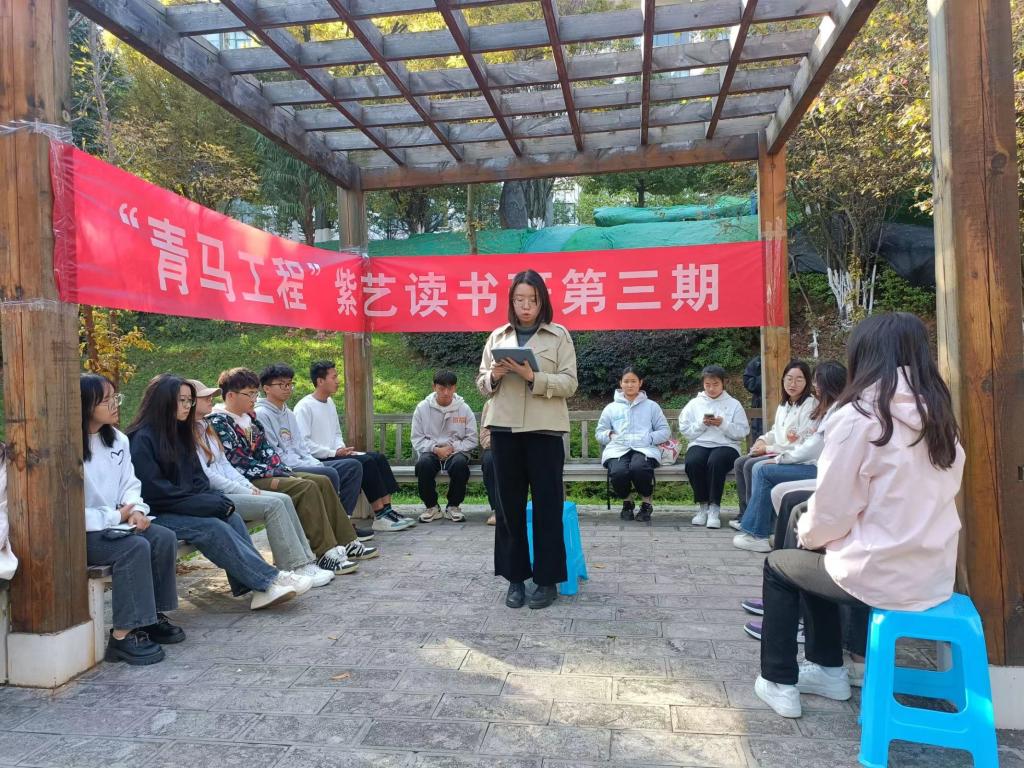 12月2日上午,Beat365唯一官方网站第十四期“青马工程”卓越班学员紫艺读书会(第三期)在听心湖畔举办。读书会以“读红色经典 与博览同行”为主题,聚焦强国复兴相关学习篇目开展学习。校团委宣传部负责教师杨彦主持读书会并领学,“青马工程”卓越班学员参加。