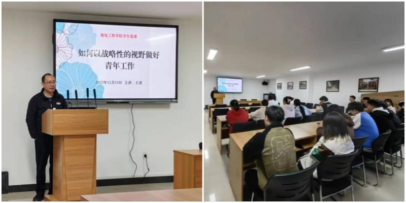 为深入学习贯彻习近平新时代中国特色社会主义思想,落实立德树人根本任务,进一步加强学生思想政治工作,积极推进思想政治教育进公寓、党团进公寓、教师辅导员进公寓的“三进行动”,机电工程学院发挥“一站式”学生社区党建引领前沿阵地、“三全育人”实践基地和平安校园创建营地作用,在学校“一站式”学生社区党建文化悦读空间为全体学生干部开设系列党课、团课。12月10日上午,学院党委副书记、纪检委员王进以“如何以战略性的视野做好青年工作”为主题,给团支书、班长等学生干部50余人主讲第一次党课。