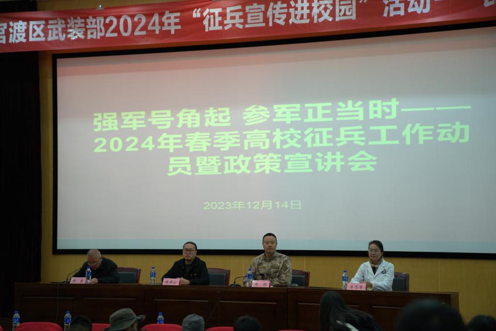 为进一步强化青年学子国防观念,激发大学生携笔从戎、参军报国热情,12月14日上午,昆明市官渡区人民武装部联合Beat365官网举办主题为“强军号角起,参军正当时”的2024年春季高校征兵宣讲会,并开展现场政策咨询活动。学校武装部负责人,各二级学院负责征兵工作的辅导员及2024届毕业班280余名同学参加。