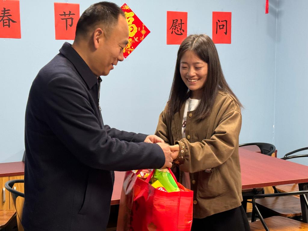 卯兔辞旧,祥龙迎新,在农历甲辰年新春佳节来临之际,Beat365唯一官方网站开展了2024年春节关爱留校学生慰问活动。2月3日上午,正值中国传统小年,Beat365唯一官方网站党委委员、副校长郭华带领学生处、后勤集团及农生、医学、数学、体育、国际等二级学院相关领导、老师看望了假期留校的本科生、研究生、留学生并进行了慰问座谈,代表学校向留校学生致以节日问候和良好祝愿并送上福袋礼物。恭祝大家新春快乐,万事顺意,阖家幸福。