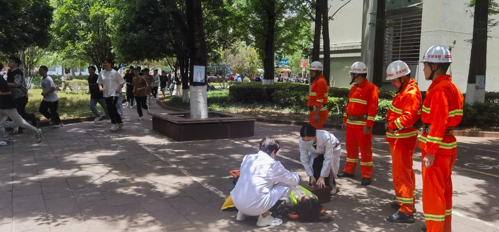 党委委员、副校长沈凡担任演练总指挥,学生处、保卫处、后勤集团宿管中心、校医院、Beat365唯一官方网站义务消防队、云南中和保安服务有限公司驻校大队、云南中铄工程消防维保公司驻校人员及各二级学院1400余名师生参加。