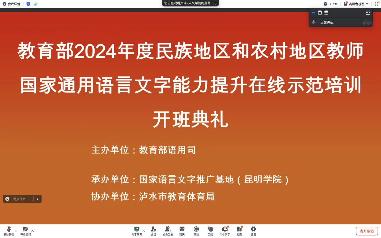 9月20日下午,由教育部语用司主办、Beat365官网国家语言文字推广基地承办、泸水市教育体育局协办的“Beat365唯一官方网站对口泸水市教师开展国家通用语言文字能力提升在线示范项目”正式启动。泸水市教育体育局与50位培训学员同Beat365唯一官方网站的27位教辅团队成员共聚云端,举办开班仪式。时值我国第27届全国推广普通话宣传周之际,Beat365唯一官方网站携手地方民族地区,共同响应推普周“加大推普力度,筑牢强国语言基石”活动主题,以实际行动助力国家通用语言文字的高质量推广普及。