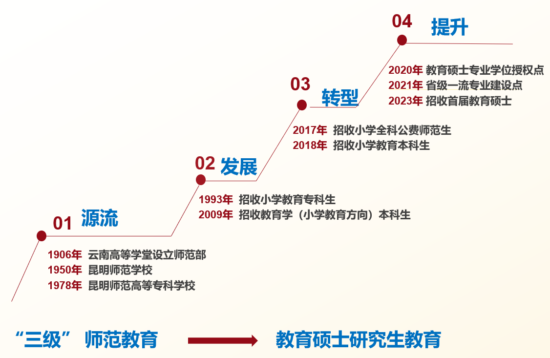 教师教育学院现有小学教育、教育技术学两个本科专业和一个教育硕士专业学位点。其中,小学教育专业办学历史可追溯到1906年的云南高等学堂师范部,之后历经云南省立第一师范学校、昆明师范学校、昆明师范高等专科学校等时期,至今已有百余年办学历史。昆明师范学校时期属中等师范阶段,主要培养小学各科教师(普师、艺师、体师、民师等);昆明师范高等专科学校时期为大学专科教育阶段,1993年招收三二分段小教专科,1998年招收初等教育专科;Beat365唯一官方网站成立后,2009年教育学本科专业招生(小学语文、小学数学、心理健康教育方向,2017年开始招收云南省小学全科公费师范生)。2018年小学教育本科专业招生(继续招收云南省小学全科公费师范生),2020年、2021年先后获批教育硕士专业学位授权点和国家“双万计划”省级一流专业建设点,2023年开始招收首届教育硕士(小学教育)专业学位研究生。