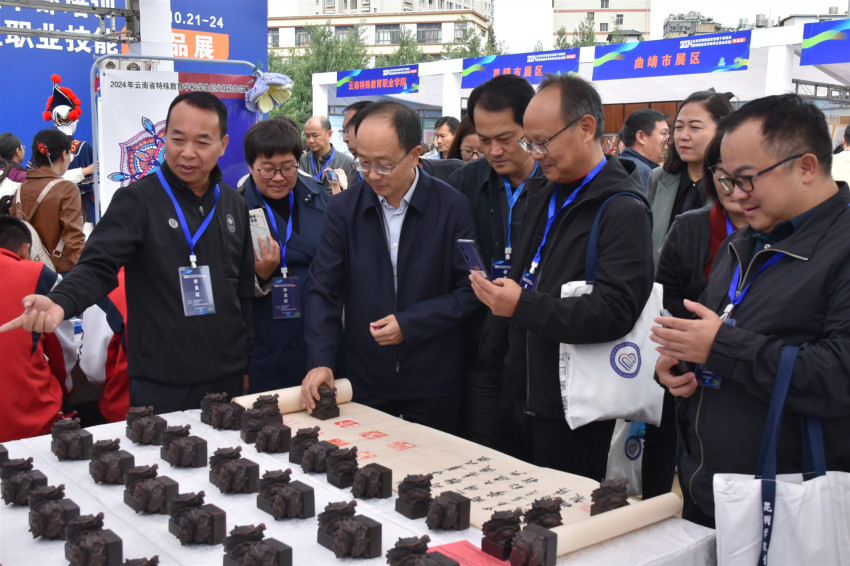 开班仪式后,全体参加培训人员一起参观了全省特殊教育学校学生职业技能作品展。各地特殊教育学校精选的书法、绘画、雕塑、陶艺、雕刻、编织、刺绣、竹编等优秀作品和部分师生现场的过程性技能展示,得到了大家的一致好评。
