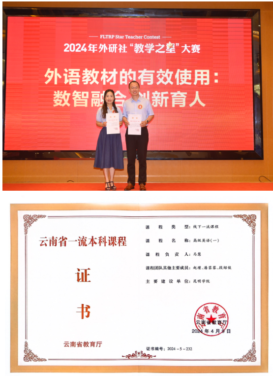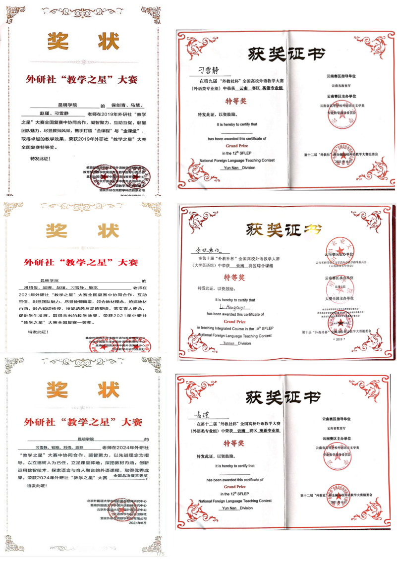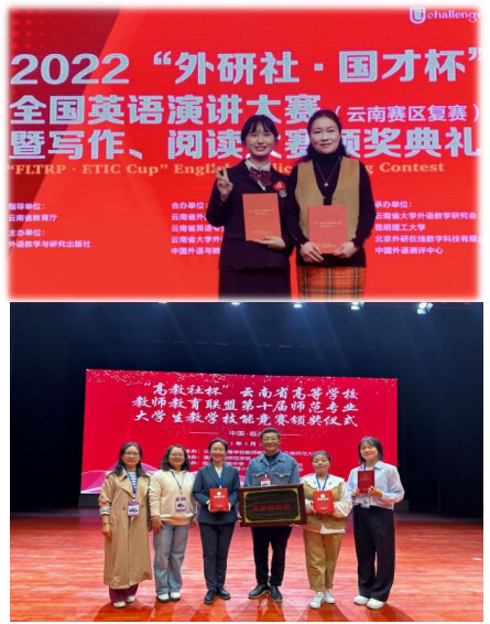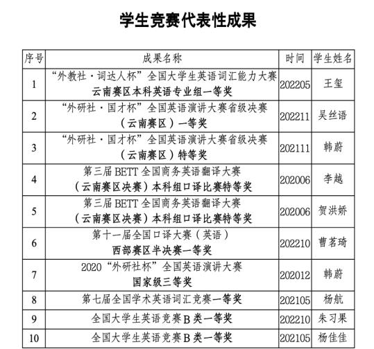 通过“三全育人”赋能学生“五育并举”育人体系的实施,学生专业发展成效显著。2018年至2024年全国大学生英语竞赛,78人获得省级以上奖项;“外研社杯”全国英语演讲、阅读、写作、笔译、口译大赛,20人获得省级以上奖项;全国大学生学术英语词汇竞赛、“外教社•词达人杯”全国大学生英语词汇能力大赛,190人获省级以上奖项;“高教社杯”云南省高等学校教师教育联盟第十届师范专业(英语)大学生教学技能竞赛、英语教学设计大赛,35人获省级以上奖励;云南省高等学校东南亚语演讲比赛,9人获省级以上奖项。