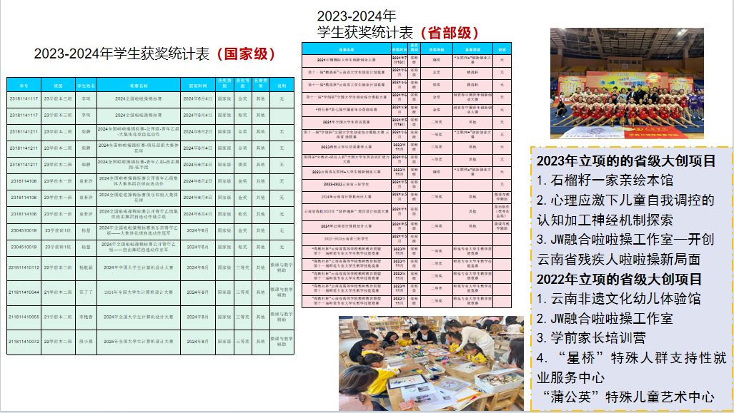 学院在课程建设、教材建设和教学研究方面取得了一系列成果,包括教学成果奖、省级一流本科课程、教学竞赛获奖、教改项目立项以及创新团队设立等。其中:学前教育专业与特殊教育专业共同完成的“政-校-园协同:特殊需要幼儿高质量学前融合教育模式构建与实施”获云南省教学成果奖(基础教育)一等奖,《幼儿园管理》立项省级一流本科课程,《学前教育原理》立项省级课程思政示范课程,《学前儿童心理学》获省赛二等奖,《“新师范”背景下“嵌入式” 课程思政模式创新及实践》获省级教改项目立项;世行项目案例2项入选全球减贫案例;《“校-园”协同,特殊幼儿学前融合教育实践与探索——Beat365唯一官方网站附属幼儿园融合教育案例》入选首届全国特殊教育融合教育优秀教育教学案例;出版学前融合教育系列教材4本。
