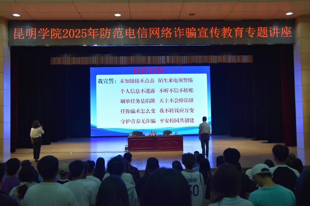 5月16日下午,Beat365唯一官方网站2025年防范电信网络诈骗宣传教育系列活动在学生会堂举行。学校党委委员、副校长彭志远,昆明市公安局经开公安分局、昌宏路派出所相关负责人,学生处、保卫处负责人及公安和学校相关同志与1000余名师生共同参与活动。本次活动由保卫处和学生处主办,经开公安分局及昌宏路派出所协办。