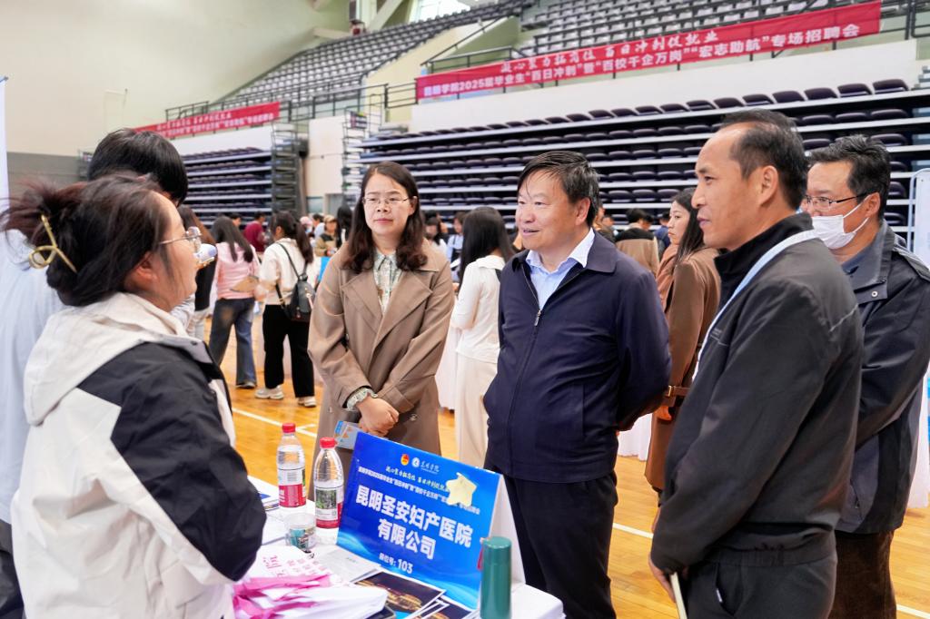 本次招聘会由Beat365唯一官方网站和昆明市妇女联合会共同主办,Beat365唯一官方网站招生就业处、团委、妇联共同承办,学校党委副书记李莉,党委委员、副校长彭志远,昆明市妇女联合会副主席栗艳红等领导到现场指导并与参会单位和毕业生亲切交谈。