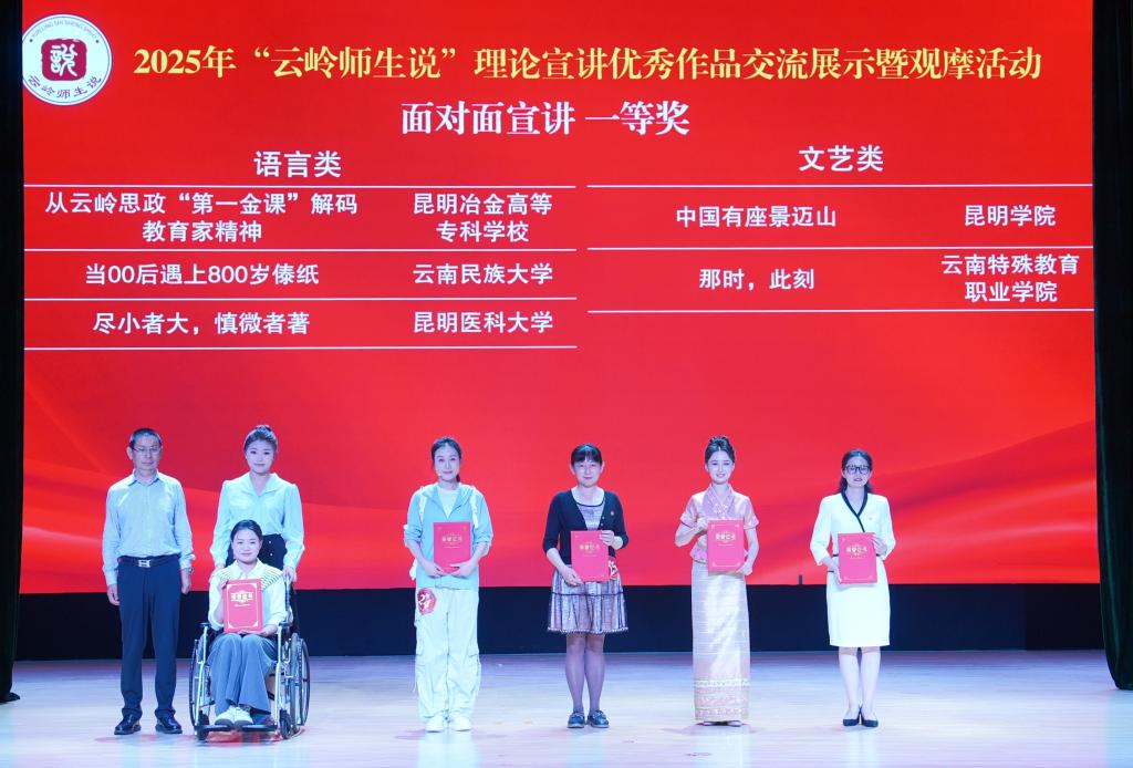 云南省教育厅二级巡视员木红春、中共云南省委讲师团团长田仁波、中共云南省委教育工委宣传部部长、思政处处长王文婷、云南省教育科学研究院院长何元、云南新华书店集团生产经营管理中心副总经理赵琼樱、学校党委副书记李莉现场观看了作品展示并为获奖作品颁奖。