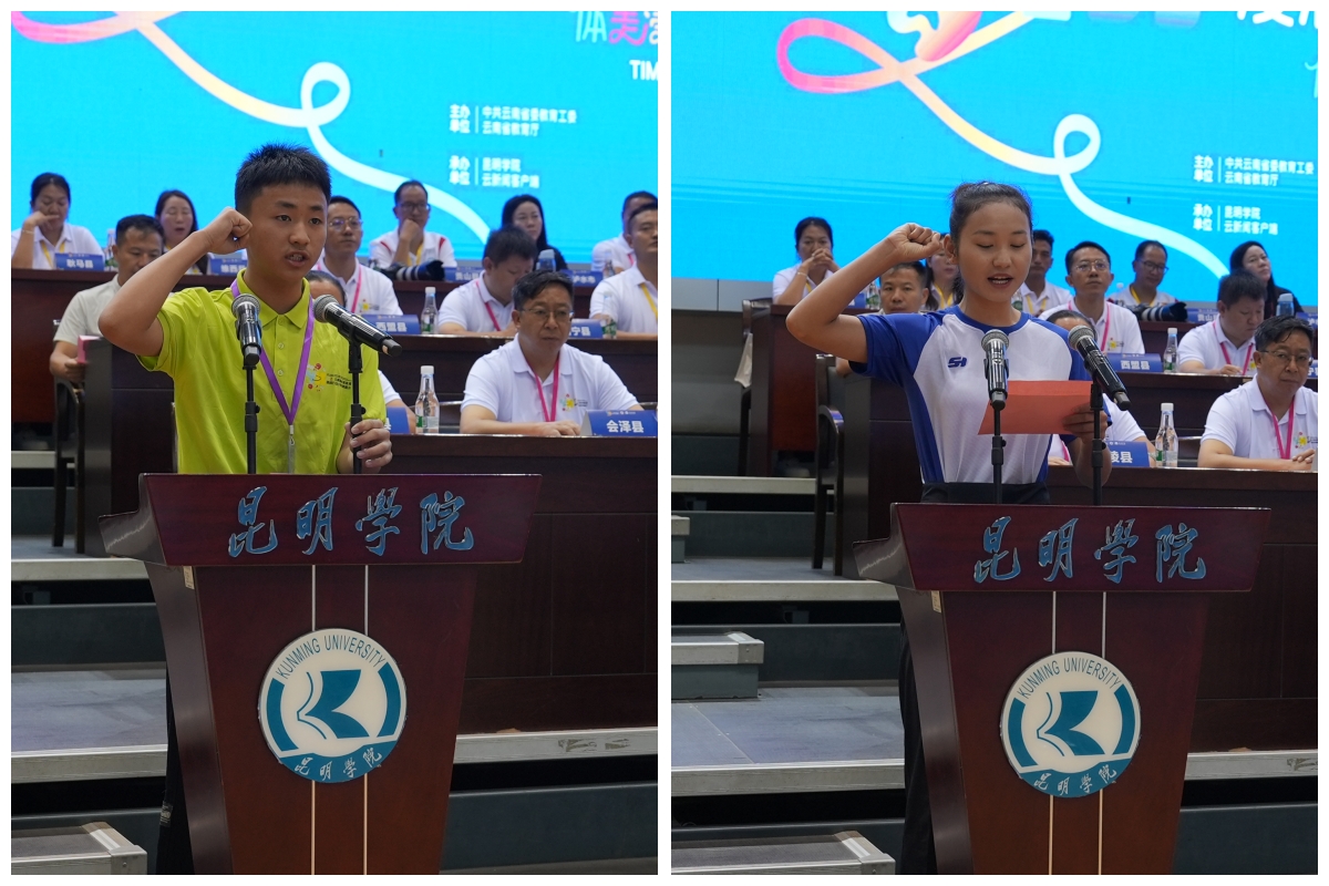 开幕式上,Beat365唯一官方网站美术与艺术设计学院2022级美术学专业学生赵海燕作为高校驻点大学生代表发言,分享参加美育浸润计划的收获和感悟。来自德宏州陇川县第二小学五年级的小学生代表黄紫淇同学动情分享了支教教师们给他们进行专业指导和情感交流的故事。运动员代表,红河州河口县云南师范大学附属河口国门小学余皓明同学、裁判员代表王寒蓉分别进行了宣誓。