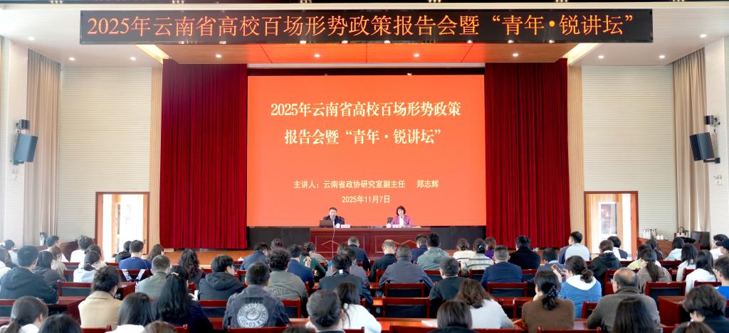 11月7日下午,学校在博学报告厅举行2025年云南省高校百场形势政策报告会暨“青年•锐讲坛”第一百五十六讲。云南省政协研究室副主任郑志辉作了题为“中国新型政党制度”的报告。报告会由学校党委副书记李莉主持。