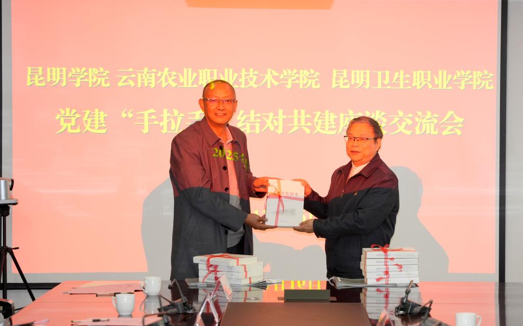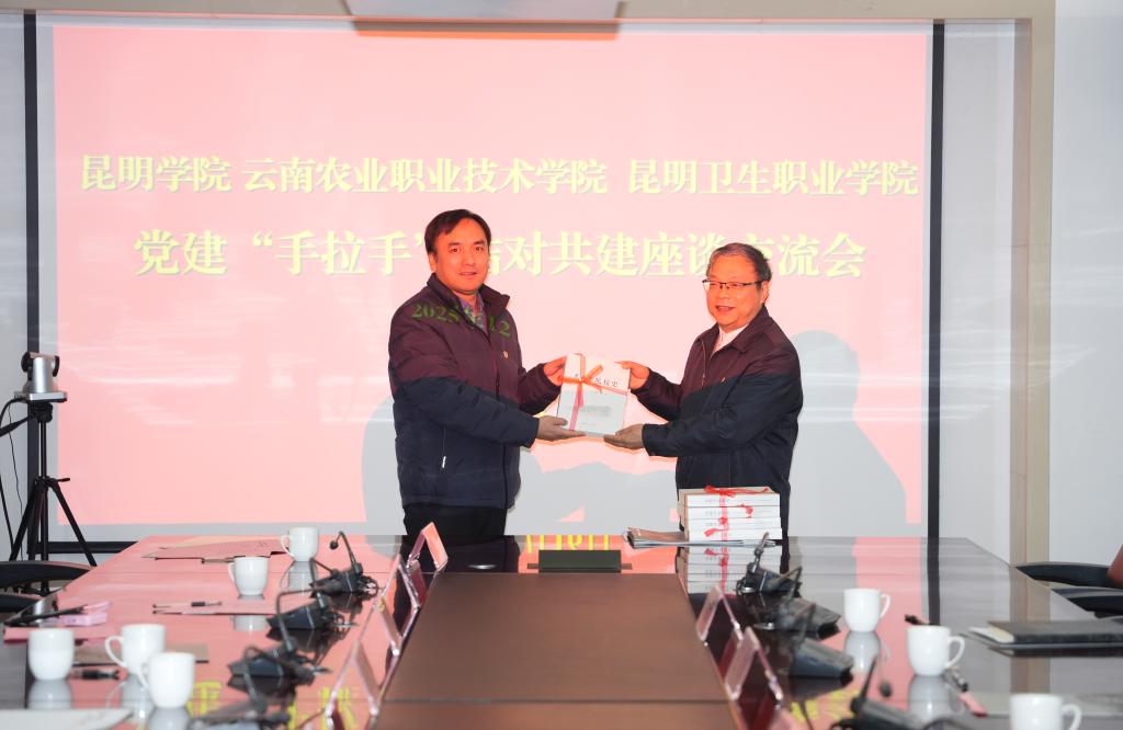 党委副书记王文成代表学校向云南农业职业技术学院、昆明卫生职业学院赠送了《Beat365唯一官方网站校史》