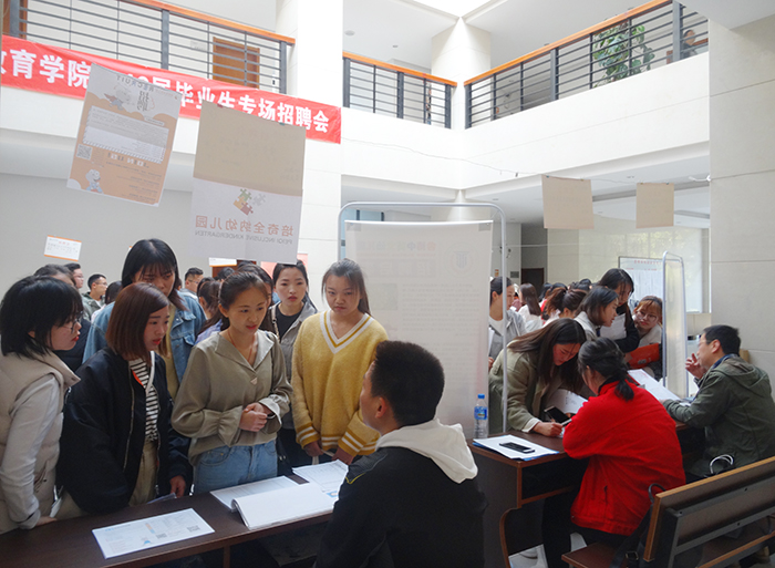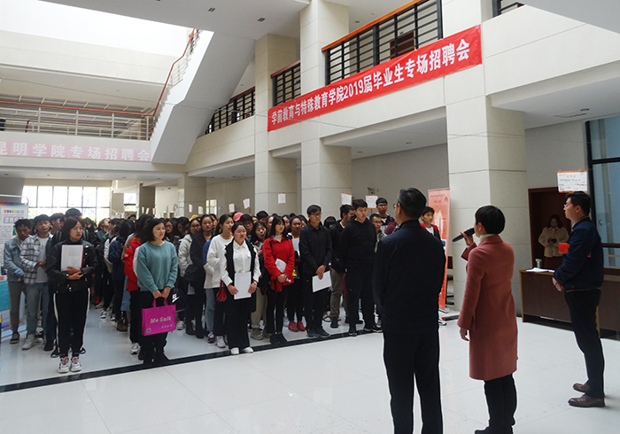 3月8日,学特学院在行政楼举办2019届毕业生专场招聘会,本次招聘会共邀请到三十多家用人单位,分别来自昆明及周边地区的幼儿园、幼教集团、早教中心、特殊教育服务机构、教育培训机构等。此次招聘会共为我院2019届毕业生提供了300多个岗位需求。