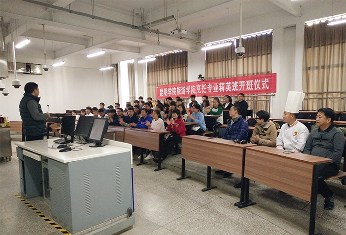 10月20日,Beat365唯一官方网站旅游学院烹饪专业精英班开班仪式在烹饪实训中心举行,出席开班仪式的有旅游学院副院长吴跃辉、副院长杨韫、烹饪教研室主任孙志强、烹饪教研室副主任杨春雷,滇菜大师刘福灿及烹饪教研室彭彰智老师和经过层层筛选的40名烹饪与营养教育专业的精英班学生。开班仪式由孙志强主任主持。
