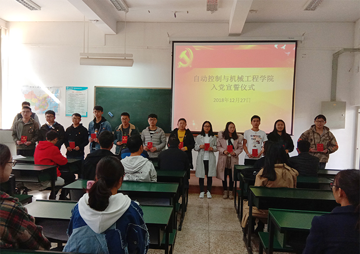 12月27日,自机学院学生党支部在博识楼2201教室为自机学院2018年下半年发展的23名预备党员举行了集体入党宣誓仪式,参加入党宣誓仪式活动的还有学院党总支书记张茂荣同志、副书记张大卫同志、组织员栗勋同志、学生3支部书记杨丽媛同志、部分学生支部支委员及60名入党积极分子代表,栗勋同志主持入党宣誓仪式。