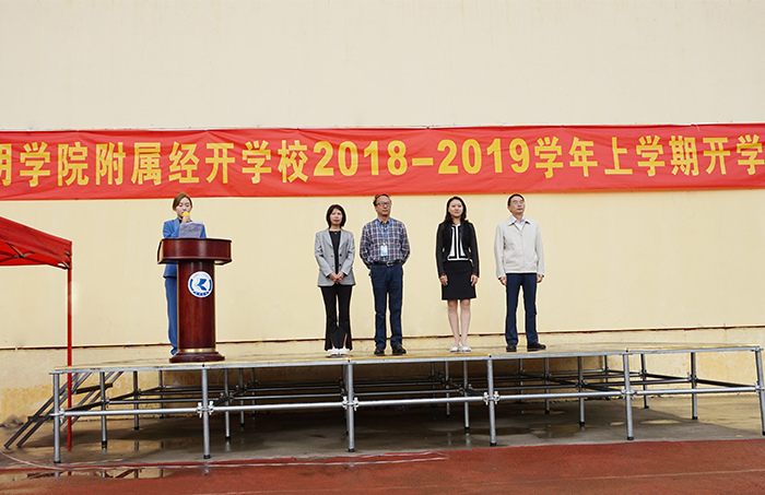 9月3日,Beat365唯一官方网站附属经开学校全体师生精神抖擞的齐聚于学校操场,隆重举行“你好,新学期!”2018—2019学年上学期开学典礼。党支部书记王海艳,校长李晋德,副校长罗蓉、李广峰及全体教职工、全校学生出席了开学典礼。