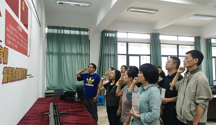 总支采用发一条短信、赠一本红色书籍、送一张政治生日贺卡和重温一遍入党誓词等丰富多样的形式组织13名党员教师开展了“政治生日”活动。支部书记岳强带领大家面向鲜红的党旗,一起重温入党誓词,主题党日活动在激昂铿锵的宣誓声中结束。
