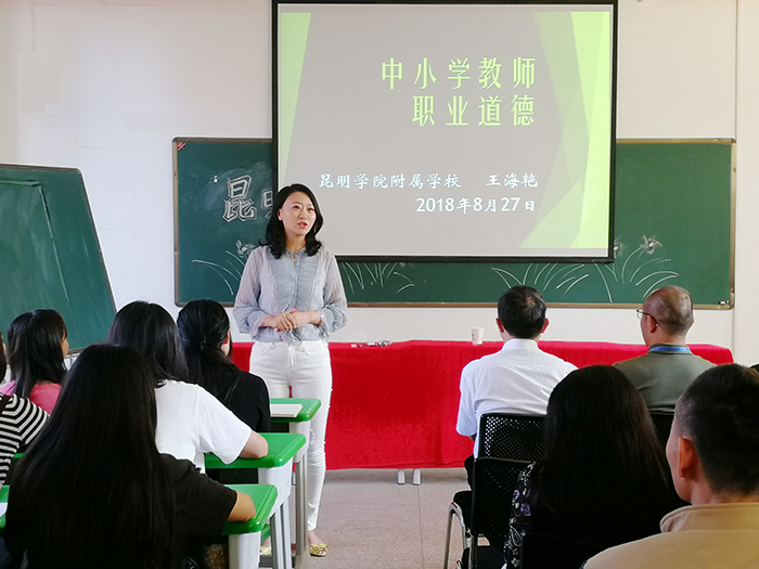 为加强Beat365官网教师队伍建设,提高教师师德和业务水平。8月25日-28日Beat365官网开展了为期4天的校本培训。此次培训有计划、有组织、有步骤,内容丰富,成绩喜人。 李晋德校长从学校工资制度改革、奖惩办法、考勤制度及学校六年发展规划向大家做交流。他将学校未来六年发展分“两个三年”走,紧紧围绕“服务、特色、质量”的发展理念,不断形成“领导服务 教师爱校 学生乐学”和“学生开心 家长舒心 社会放心”的良好氛围,从而不断实现“经开领先 昆明一流 全国示范”的总目标。李广峰副校长则从学校常规教学管理制度及教学过程中管理实施细则向大家作介绍。“没有规矩,不成方圆。”建立健全教学常规管理制度是抓好教学工作、有序开展教学活动的前提和保证。 王海艳书记为全体教师进行“中小学教师职业道德”培训,进一步规范了Beat365官网教师的从教行为,全面提升教师职业道德素养和业务素质。使得Beat365官网教师在职业道德规范的要求中不断内化为自身的自觉行为,并坚持做到正人先正己,身教重于言教、树立良好的师表形象,努力使自己的行为符合新时期教师的职业道德规范。 昆明盘龙区教育教学科研中心、昆明盘龙区教师进修学校陶树坤老师对全校教师职业规划和工作智慧等方面进行了专业指导。陶老师用一个个鲜活的师生案例向大家传授着教师如何在教育教学中展现智慧与力量,如何用潜移默化的方式带领学生进行思考与学习,帮助学生更快地成长起来。
