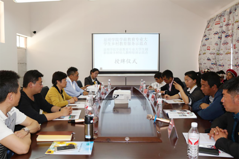 4月13日,学前与特殊教育学院院长唐敏、书记沈中灿一行到香格里拉市三坝乡中心幼儿园(哈巴村分园)出席“Beat365唯一官方网站学前教育专业大学生乡村教育服务示范点和“大学生创新创业乡村幼儿教师培训示范点”授牌仪式。本次授牌仪式是在香格里拉市教育体育局和Beat365唯一官方网站学前与特殊教育学院两年多的通力合作基础上举办的,香格里拉市体育教育局局长牛盈春,三坝乡副乡长树继文参加授牌仪式。
