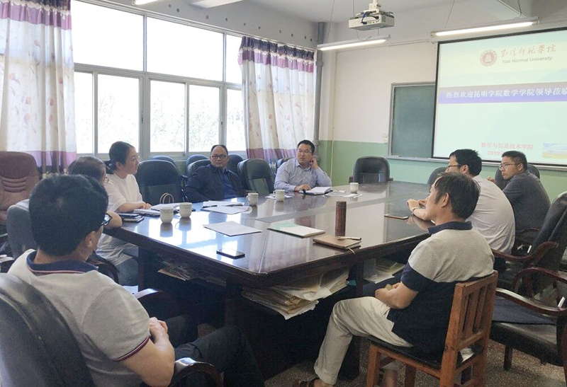 5月8日,学习考察组一行5人赴玉溪师范学院就师范专业认证的前期准备工作进行学习。玉溪师范学院数学与应用数学专业(初中数学)是云南省开展师范认证的5个试点专业之一,该专业所在的数学与计算机科学学院自2018年6月启动认证申请、数据填报及自评报告撰写等相关工作。数学与计算机科学学院刘云院长就师范认证的准备工作、培养方案的编制工作及自评报告的撰写工作依次进行了详细的介绍,强调了师范专业认证自评报告中应重点把握的几个关键点,并对数据填报中存在的困惑和遇到的困难进行了细致的讲解,希望在进一步的工作中和Beat365唯一官方网站一起交流和共同探讨。