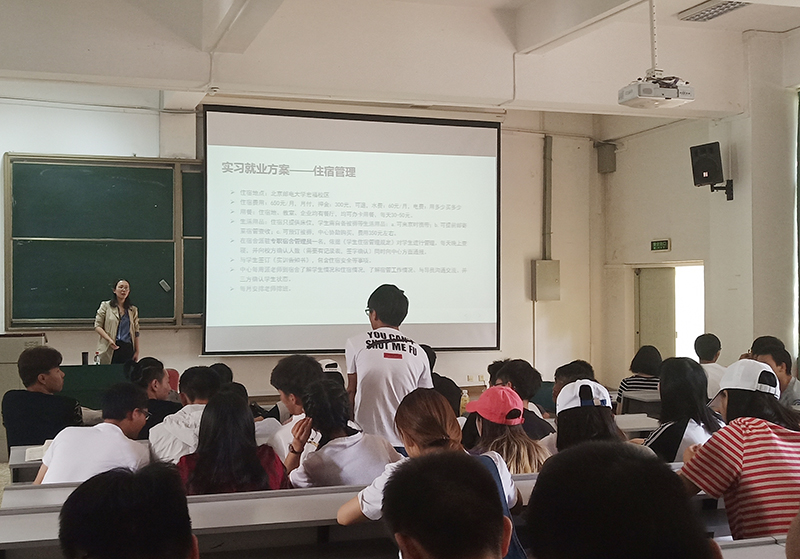 随后,来自中关村软件园的卢文静老师通过结合自身经历介绍了近年来IT行业的的下降与回升,并指出现阶段IT行业有很好的发展前景。她表示到北京实习是一个新的起点,不必纠结于过去,可以在为期两个月的实训中,拼一拼,搏一搏,激发自己的潜能,中关村软件园会给大家提供机会,所以同学们要做好准备,打好基础,学好技能,在众多优秀的毕业生中脱颖而出,要成功地将自己销售出去。