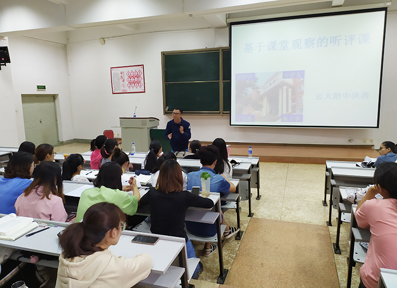 75日上午,化学化工学院邀请云南大学附属中学洪涛老师作 “基于课堂观察的听评课”的中学化学教师职业技能训练系列讲座。讲座由副院长李维莉主持,邓秀君和何红星老师以及学院2016级、2017级和2018级全体化学专业(教师教育方向)的学生参加。