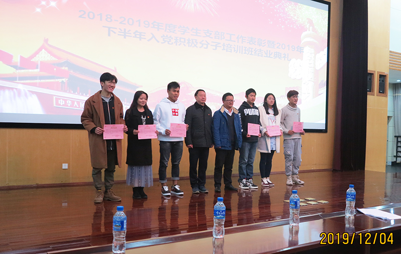 会上,201911月新接收的预备党员进行了入党宣誓,出席活动的老师向支部工作中表现突出、成绩优异的的同学颁发证书和奖品,各支部表演精心准备的节目,表达了广大青年学子对祖国、对党的热爱,对自己生活的期待以及在接下来的学习和生活中继续努力的决心。