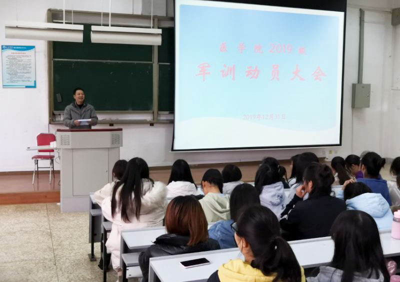 20191231日,医学院在博识楼1001阶梯教室召开2019级新生军训动员大会,学院党委副书记张培宏作动员讲话。会议由医学院团总支书记杨家兴老师主持,军训带队辅导员耿明、邹云光和全体参训同学共260余人参加。