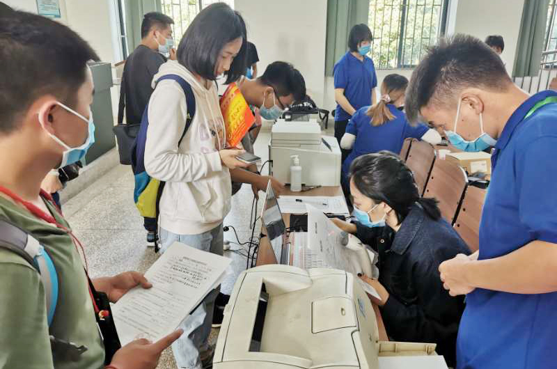9月2日,新生有序报到,迎新志愿者和老师为新生办理入学手续,解答家长提出的问题,给家长和新生留下深刻印象,顺利完成了本次专升本新生报到工作。