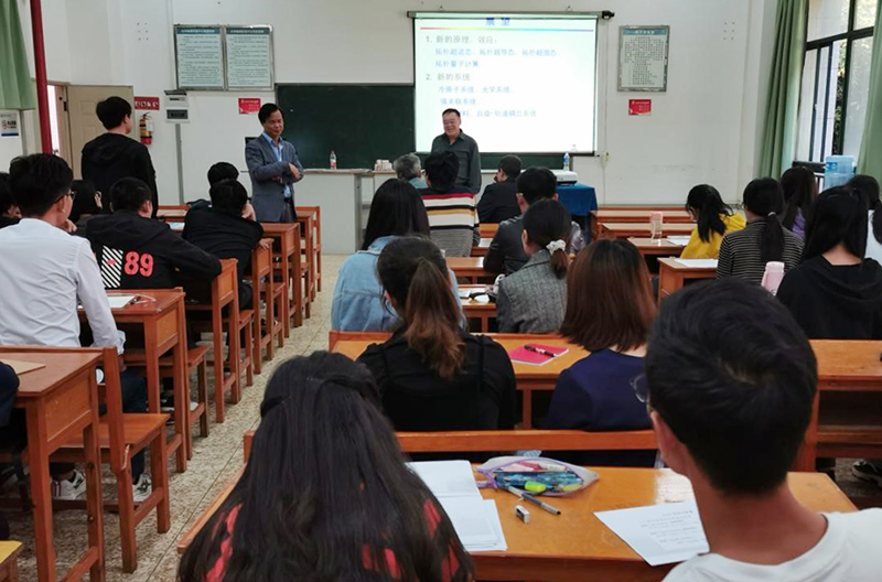 刘伍明研究员详细讲解二维材料拓扑量子态,例如拓扑超导、拓扑超流、拓扑量子相变、强关联拓扑效应、反常量子Hall效应、自旋Hall效应等新奇量子态和量子效应,号召Beat365官网硕士研究生继续攻读博士研究生。这次学术报告不仅使学生和教师在知识方面受益,而且也激起师生的科研激情。报告现场,刘伍明研究员与全体师生进行热烈互动,氛围活跃。