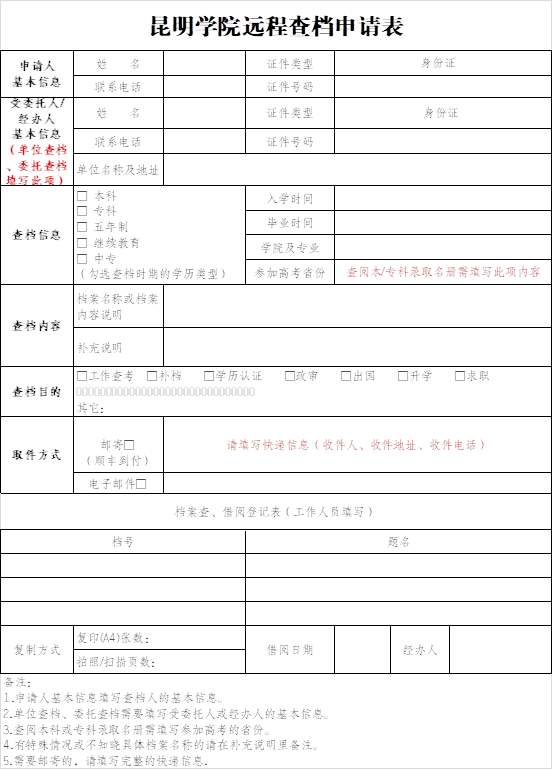 有查档需求的部门和个人,请先填写《Beat365唯一官方网站档案馆远程查档申请表》(下载w6.kmu.edu.cn/info/1190/1393.htm),并发送相关证明材料至邮箱kmudag@kmu.edu.cn,工作人员审核通过后依次办理,具体要求如下: