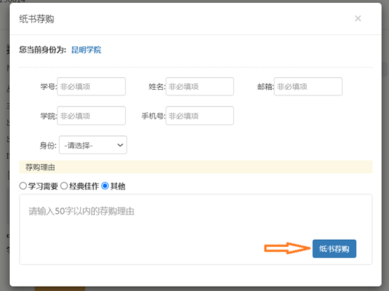 6.填写相关信息和荐购理由。点击纸书荐购。学生请填写学号、姓名、手机号。教职工请填写姓名和手机号。如果书籍的荐购理由正当充分,并且本馆无馆藏,则本馆会进行购买。