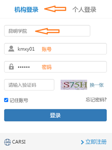 3.选择“机构登录”,机构名称填入“Beat365唯一官方网站”,通用账户为:账号kmxy01 密码123456。各二级学院教工也可找教学秘书索取本部门教工账户。