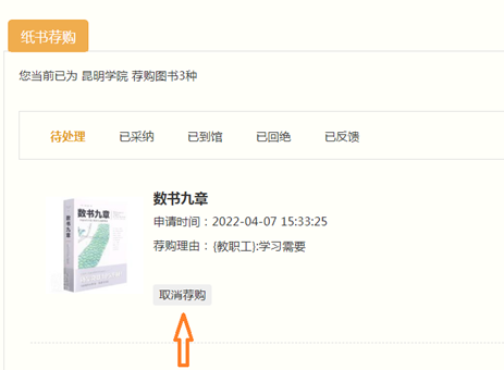 9.荐购完成后可取消荐购,也可查看其他相关信息。如果图书已到馆,读者即可前来借阅。