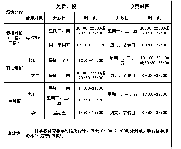 1.免费开放时段只针对本校师生,入场须出示有效证件。如有教学、训练及校级活动安排,免费开放时段取消。