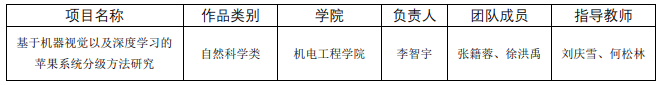 根据团省委工作要求和《第十八届“挑战杯”全国大学生课外学术科技作品竞赛校级赛事组织得分实施细则(试行)》文件精神,特对进入国赛的作品《基于机器视觉及深度学习的苹果分级方法研究》进行公示(具体信息如下),公示期5天(2023年6月13日-6月17日),广大师生如有异议,可在2023年6月17日前向校团委学术科技部反映。联系电话:15125270529。