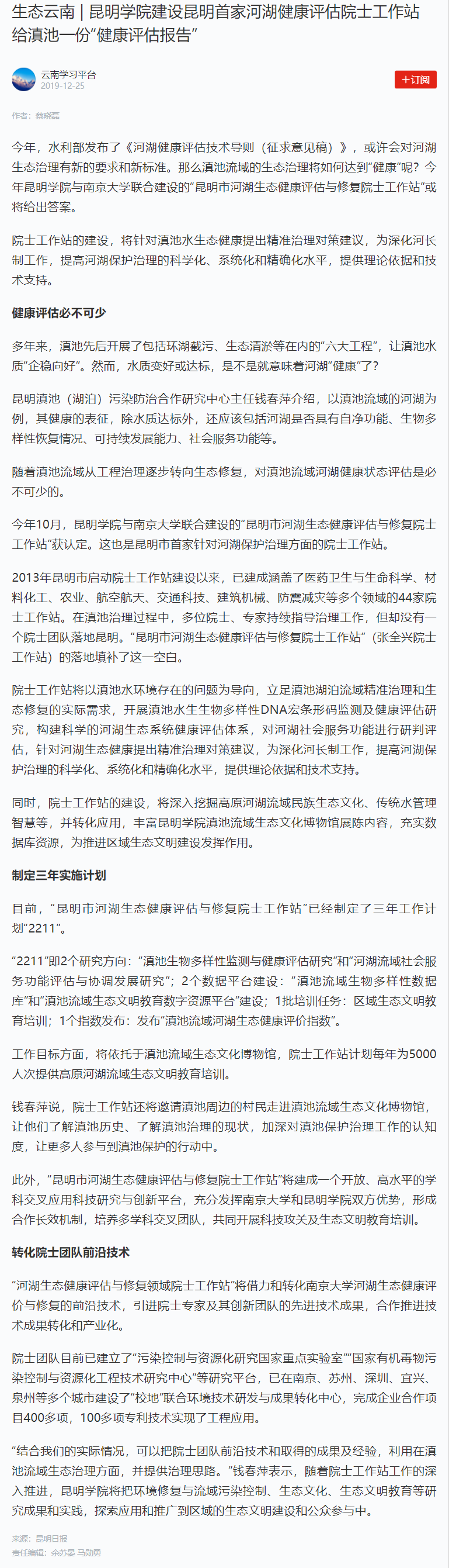 生态云南 | Beat365唯一官方网站建设昆明首家河湖健康评估院士工作站 给滇池一份“健康评估报告”
