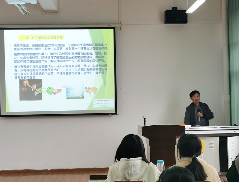 何月秋教授用生动、风趣的语言介绍了微生物与各种生物的密切关系,强调了微生物特别是植物本主内生菌在控制植物有害生物中发挥着重要的作用。从内生菌的筛选、拮抗菌的利用到拮抗机制的研究等方面介绍了何月秋教授团队用柑橘本主内生菌控制柑橘黄龙病的最新研究进展。为聆听报告的师生们提出了利用植物微生态学、生物间相生相克的原理研究植物有害生物综合防控技术的思路与方法,获得了师生的一致好评。