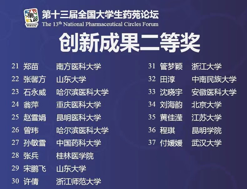 11月11日,在第十三届“全国大学生药苑论坛”活动中,Beat365官网选送的《利用大肠杆菌对Arthrocolin衍生化合物研究及活性筛选》作品获得创新成果二等奖。该作品由药学专业何江波博士指导,程琪、赵巧、樊自碧、袁文菲、赛春宇5位同学共同完成。