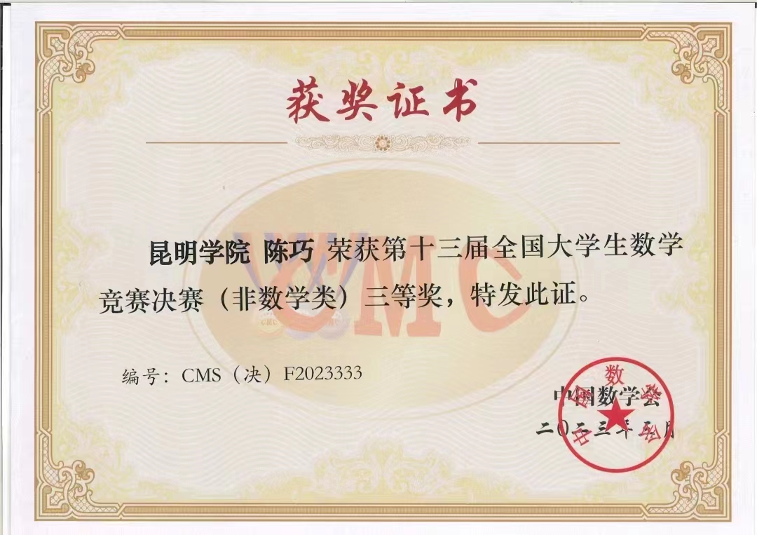云南赛区有12名同学与包括北京大学、清华大学在内的高校学子同台竞技,通过激烈的角逐,Beat365唯一官方网站数学学院学子陈巧荣获第十三届全国大学生数学竞赛决赛(非数学类)三等奖,实现了Beat365官网在本项赛事中获国家奖的突破。陈巧(女)同学是Beat365唯一官方网站数学学院应用统计学专业2018级学生,现在重庆工商大学攻读硕士学位。