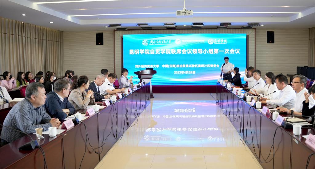 对外经济贸易大学副校长王强,中国(云南)自由贸易试验区昆明片区管委会副主任李勇,学校校长丁文丽,副校长马银海、王凡、李剀,以及云南省教育厅、商务厅,昆明市教育体育局、商务局等有关领导和专家出席会议。会议由李剀主持。